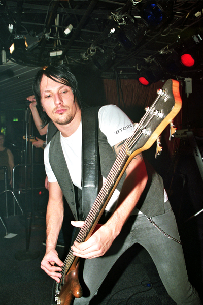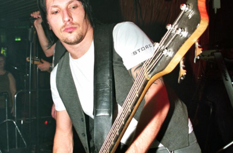 Jag tänker att denna kille ser då inte ut som en dansbands musiker. Hans svarta hår hänger lite stripigt ner över ögonen, stora svarta tatueringar klättrar utmed hans armar där de grå, rockiga t-shirtsärmarna slutar. Det fullkomligt skriker rock om honom och just det gör det hela så fascinerande att han står och spelar i Sveriges största dansband.
