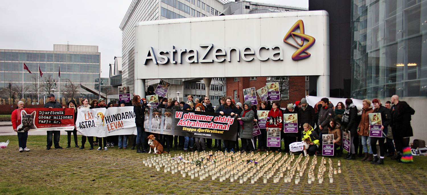 I söndags, den 23e februari, höll Djurrättsalliansen en minnesmanifestation vid AstraZenecas anläggning i Mölndal. 400 gravljus tändes för de hundar AstraZeneca för ett år sedan valde att skicka till plågsamma djurförsök. Jag var en av dem som engagerade mig i kampanjen ”Låt Astrahundarna leva”, för att rädda hundarna från att utnyttjas i försök när företagets kennel i Örkelljunga lades ned. Trots demonstrationer, både nationellt och internationellt, insändare, telefonsamtal, upprop och mänskliga blockader för att stoppa transporterna såg vi hundarna åka mot en säker död i djurförsökslaboratorium i England och Mölndal.