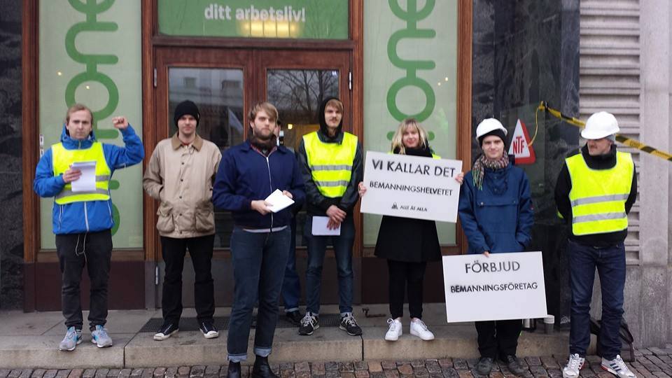 Aktionen gick till så att Allt åt alla omringade kontorshuset med avspärrningsband med trycket ”Varning osäkert arbete pågår”, höll upp skyltar och delade flygblad. Deras syfte är att avskaffa bemanningsföretag helt.