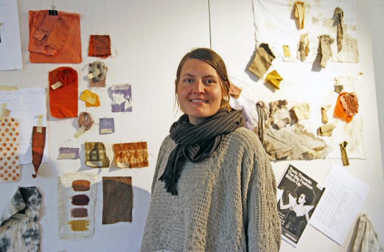 Konstnären Lina Sofia Lundin färgar kläder med rödkål, avokado-kärnor och skal av röd och gul lök. Hon är med i utställningen En färgares rum i Fredriksdals museeer och trädgårdar i Helsingborg.