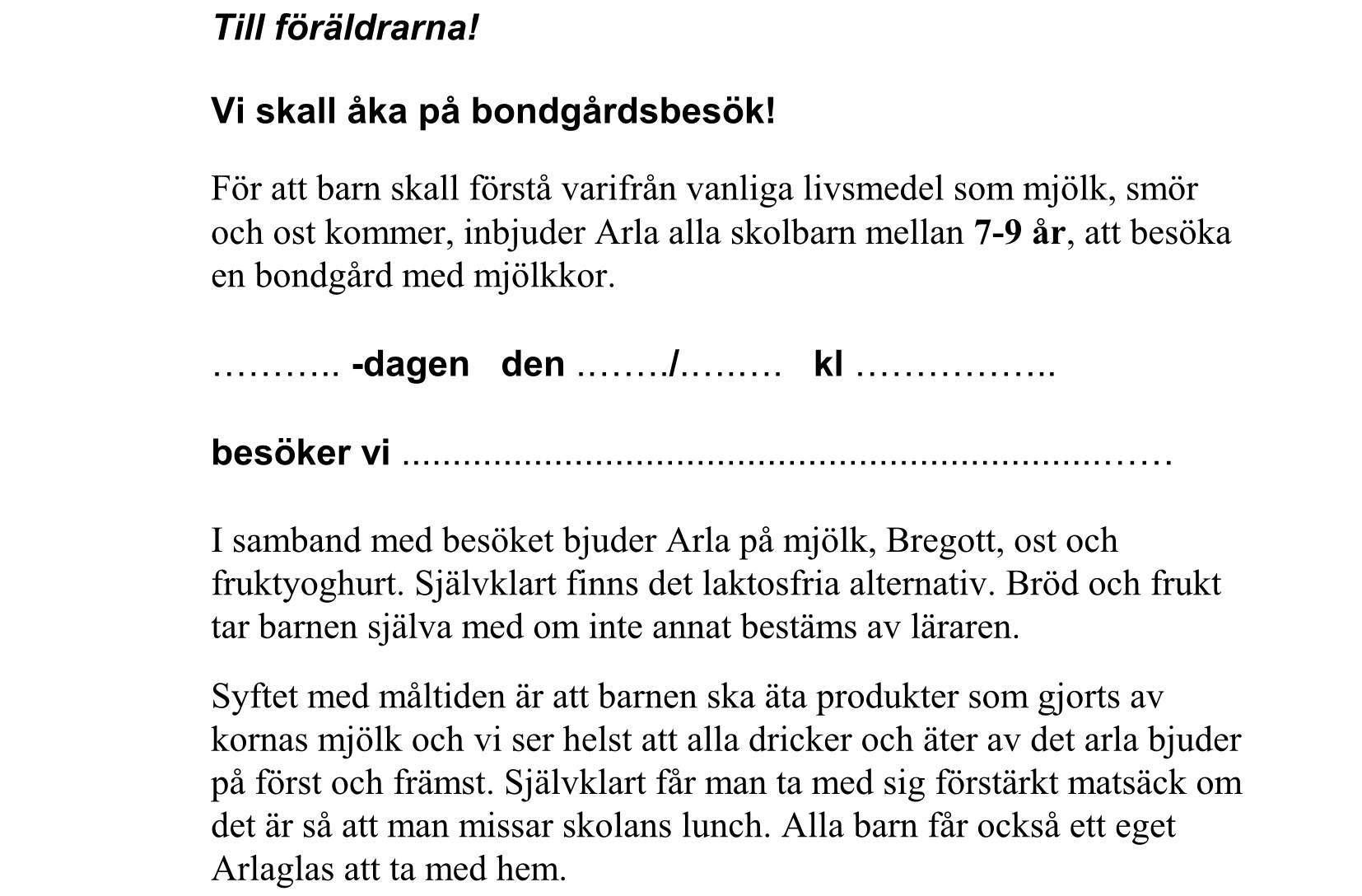 Men inbjudan är inte bara en lapp som ger information om utflykten. Där står också att eleverna kommer att bjudas på Arlas produkter, som Bregott. Man får ta med sig en förstärkt matsäck, men i inbjudan finns också uppmaningen att ”vi ser helst att alla dricker och äter av det Arla bjuder på först och främst”. Inbjudan är skriven av Arla, men lämnas ut av skolans personal.