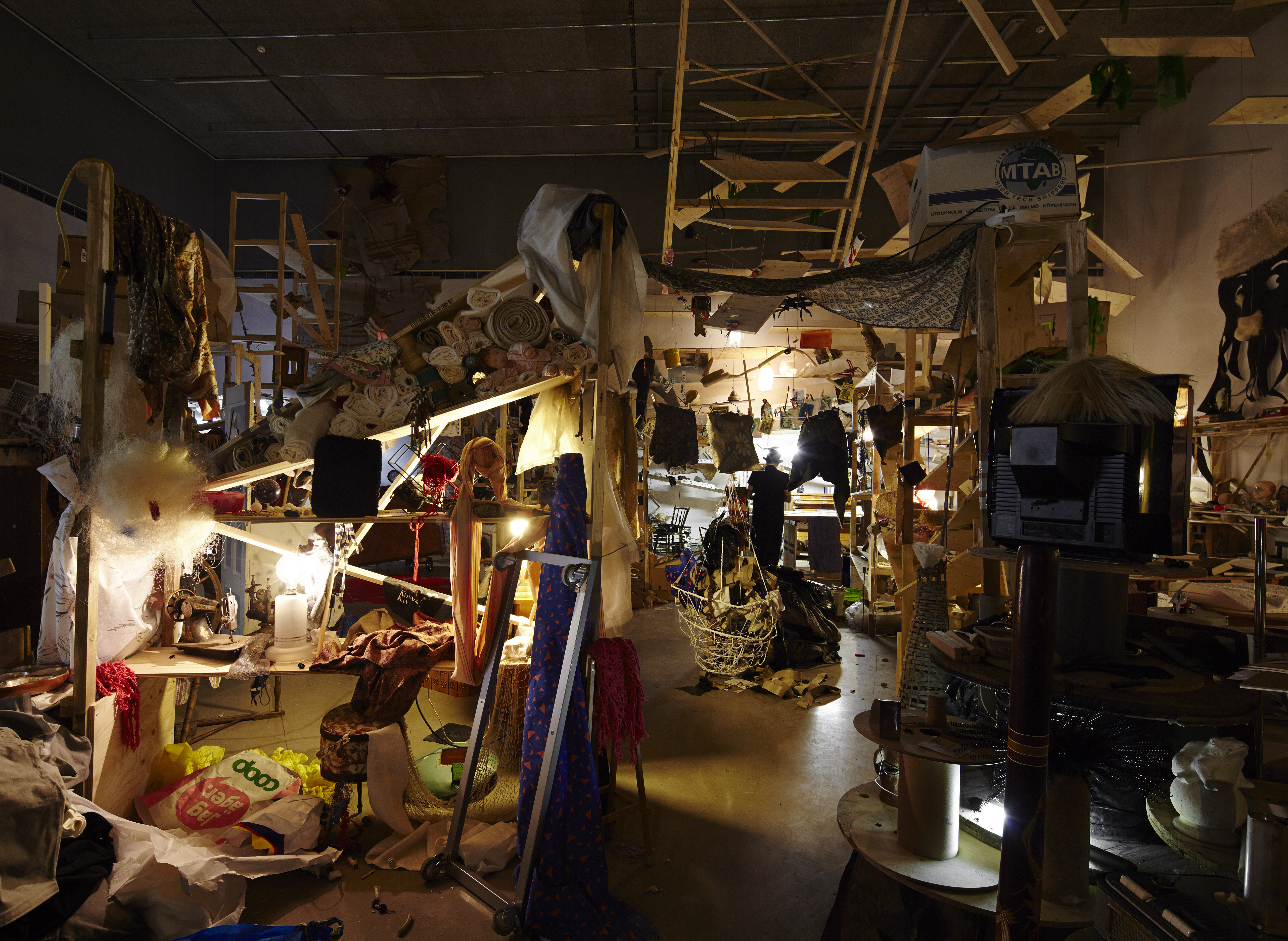 Till en början känns man sig desorienterad, men efter att ha gått ett par varv längs gångar som löper genom installationen börjar jag själv upprätta ett sammanhang, tänka mig att allt är en slags hemvist. Delvis fysisk men kanske mest mental. Här finns ett ritbord, stora dockhuvuden, lermodeller, en skrivmaskin – som om någon ägnat tid åt att försöka skapa ordning i ett oöverskådligt kaos, vare sig det är ett inre eller ett yttre. Genom verket rör sig magikern – en man med hög katt och svart kostym med avklippta armar. Han flätar ett rep, bär runt på en bok, sitter och vilar, läser. Utför handlingar som tycks vara slumpmässiga, utan syfte.