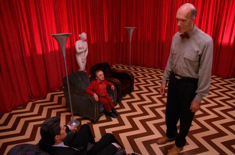 • Agent Cooper i det mytomspunna rummet med röda draperier som han återvänder till i drömmarna.