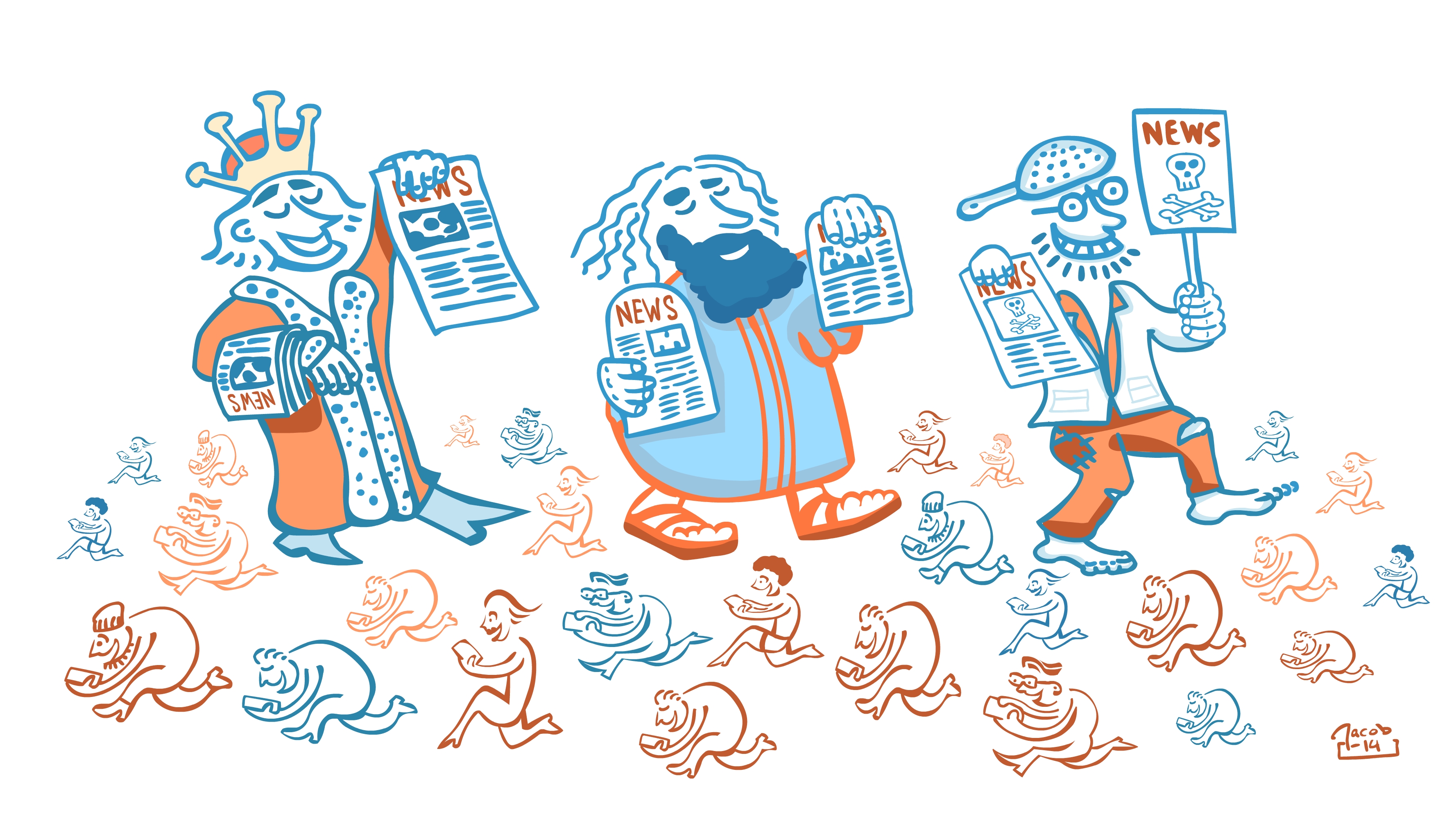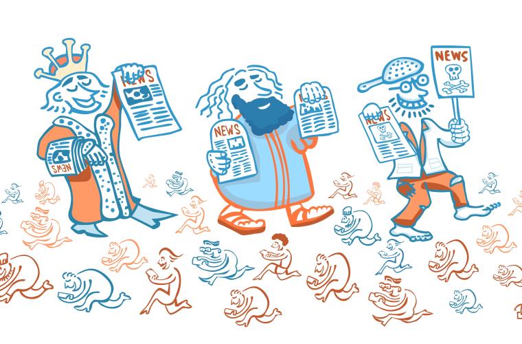 Religion kan bidra med ett hjälpsamt ordförråd även hos en sekulär institution som journalistiken. Jag vill därför prova de teologiska begreppen om kunglig, profetisk och apokalyptisk tradition i denna essä. Observera, leken med de här begreppen ska inte tolkas som stöd till någon religiös tradition, eller ens till religion i allmänhet.