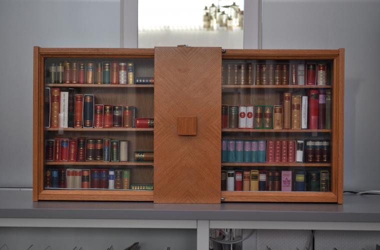Vi sitter i tidskriftsavdelningen, där det finns 180 löpande tidskrifter. Bakom oss står ett skåp i trä med miniatyrböcker.