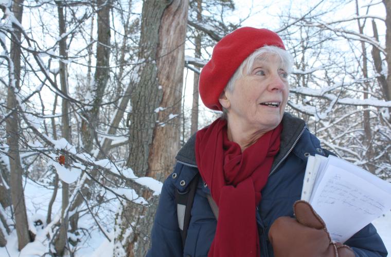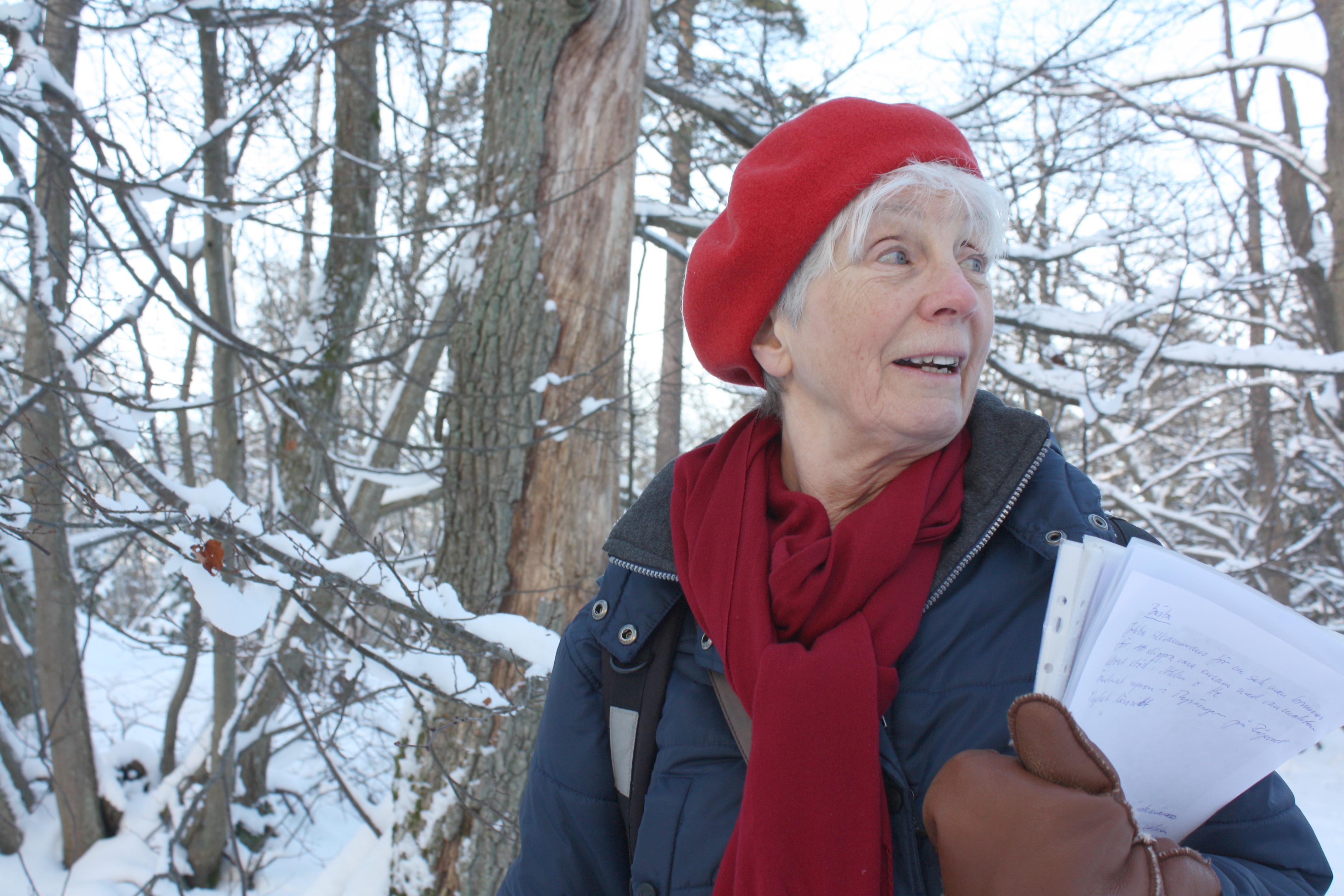 Vi vandrar upp på ett litet berg på Ekorrnäset invid Magelungen. Här uppe ligger en av Eva Wessléns favoritplatser i området. Uppe på berget står ett fint bestånd med äldre skogslindar.