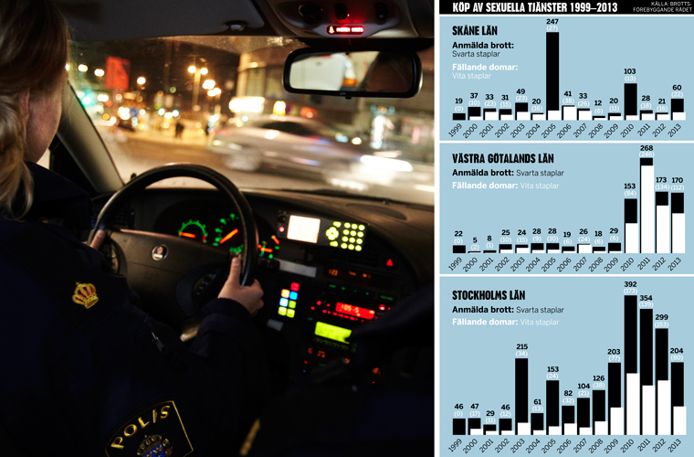 Fria har sammanställt antalet anmälda brott som rör köp av sexuella tjänster, vilket varit olagligt i Sverige sedan 1999, från dess att lagen infördes fram till och med 2013. I en jämförelse mellan de tre storstadsregionerna utmärker sig Skåne län som de allra flesta år haft betydligt färre anmälda brott som rör sexköp.