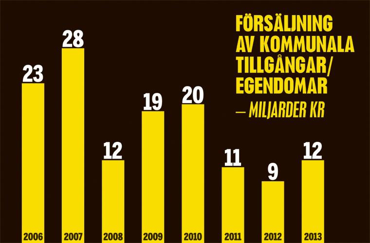 Nähä. Men kommunerna lämnar i alla fall uppgifter till Statistiska Centralbyråns nationalräkenskaper, och där finner jag faktiskt siffror som åtminstone skulle kunna ge en ledtråd. Av rapportserien ”Kommunernas finanser” framgår att kommunerna sålde tillgångar för 32 miljarder mellan 2011 och 2013. Längre tillbaka än så går inte serien och uppgifterna finns ingen annanstans på SCB:s hemsida, men av statistikern Caklin Doganson får jag dem tillskickade från och med 2006. Utifrån detta kan man räkna fram att kommunala tillgångar för sammanlagt 143 miljarder sålts under 2006–2013.