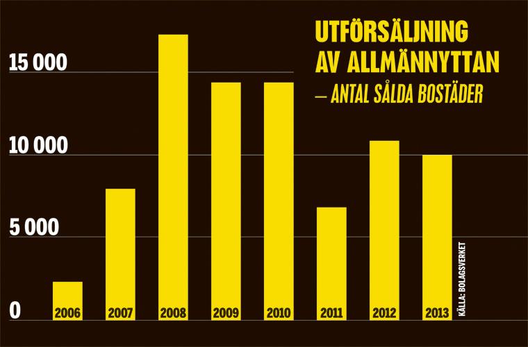 Till en del har vi här bättre statistik att gå på. Boverket sammanställer information från de allmännyttiga bostadsbolagen varje år, och om man summerar ser man att runt 145 000 allmännyttiga bostäder sålts i landet sedan år 2000. 55 procent ombildades till bostadsrättsföreningar, medan 45 procent såldes som hyresfastighet till en privat hyresvärd.