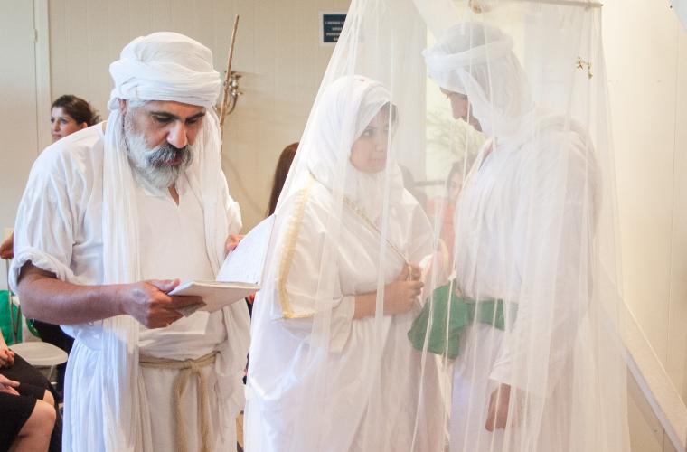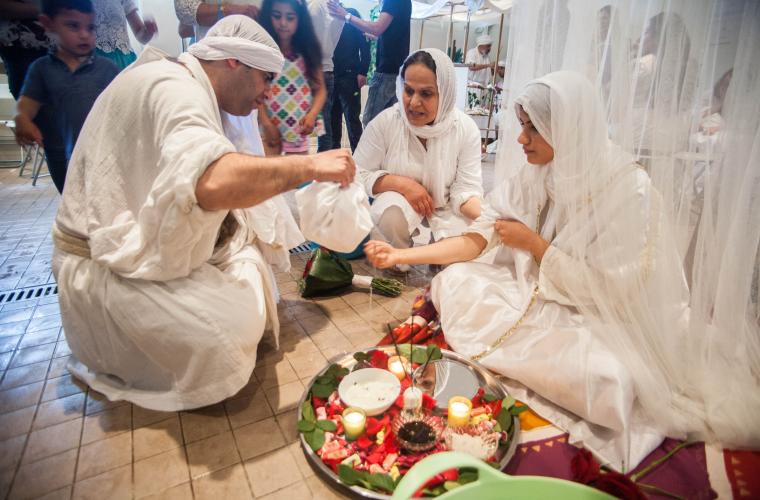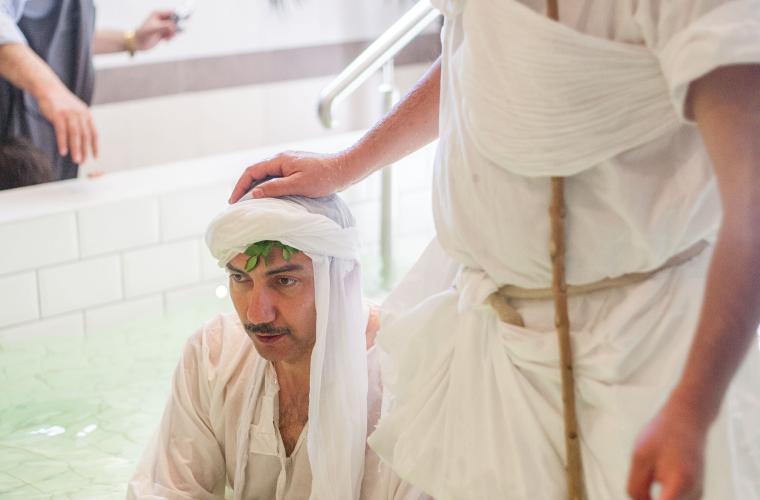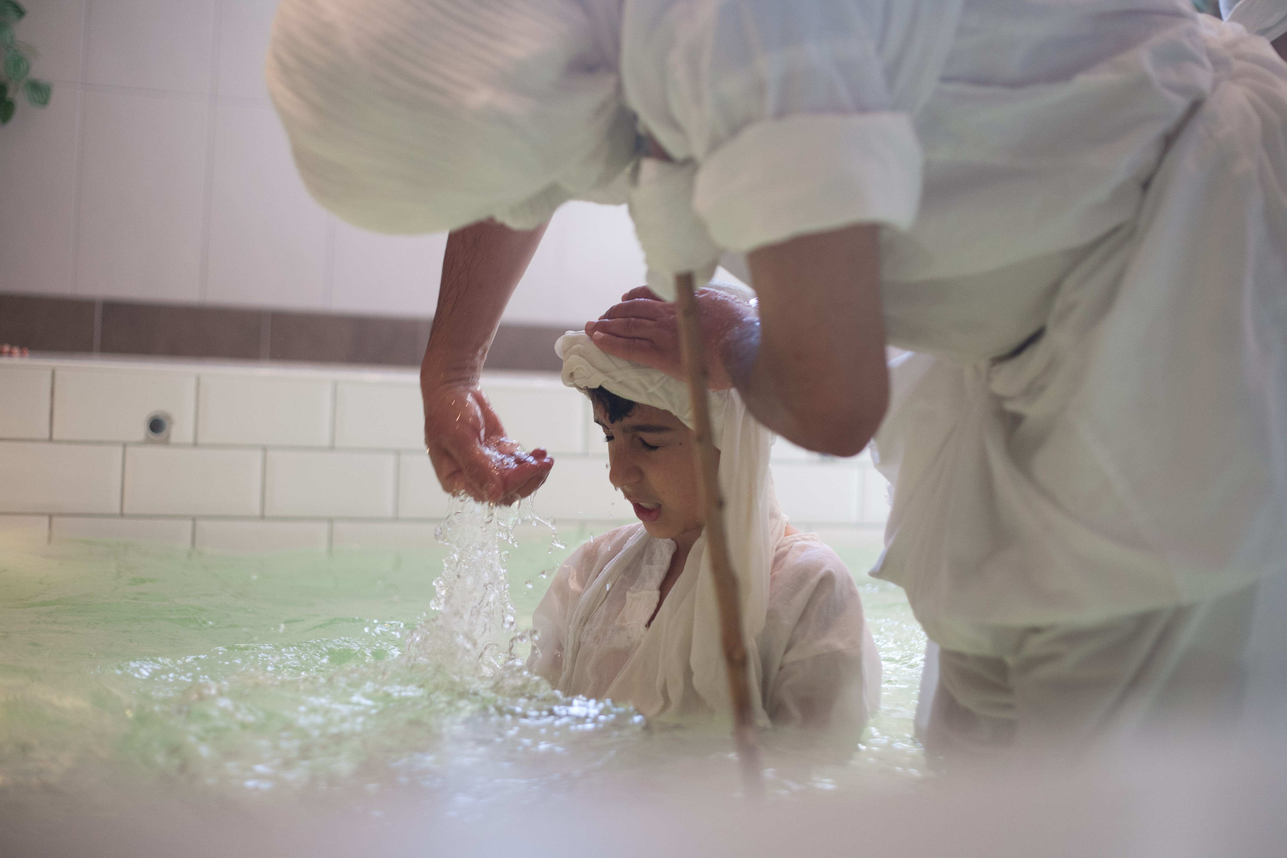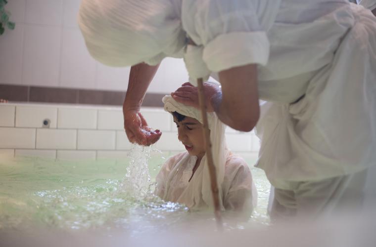 I en källarlokal i Vällingby trängs ett femtiotal personer runt ett ungt par. Trummor, skratt och kamerors klickande ekar mellan de kakelklädda väggarna. Det är söndag, och en traditionell dag för mandeiska giftermål, men även för dop. I andra änden av rummet finns en liten bassäng. En svag doft av klor kommer från en liten balja som deltagarna ska tvätta sina fötter i innan de stiger ner i vattnet. I nära 2 000 år har mandéerna utövat sin tro, centrerad kring dopets renande kraft. Från Jordanflodens strand till Iraks Eufrat och Tigris, och i dag lever traditionerna vidare i Vällingby.