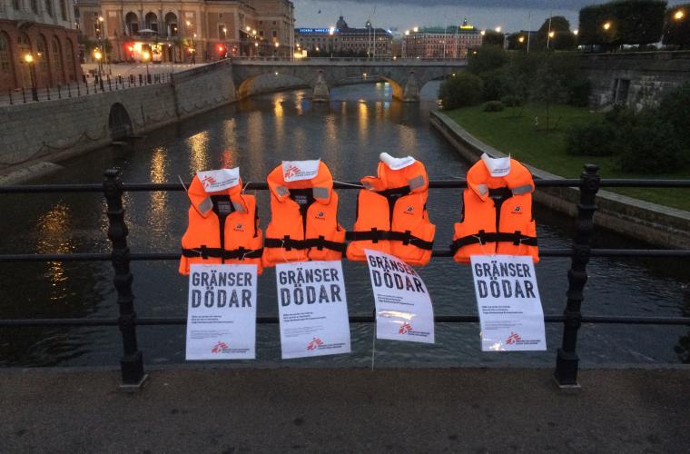 Under måndagen genomförde den oberoende medicinska hjälporganisationen Läkare utan gränser en aktion där de hängde upp 80 flytvästar runt om i Stockholm. Syftet var att berätta om båtflyktingarnas situation på Medelhavet. De överlämnade också en flytväst till regeringen tillsammans med ett öppet brev adresserat till Stefan Löfven.