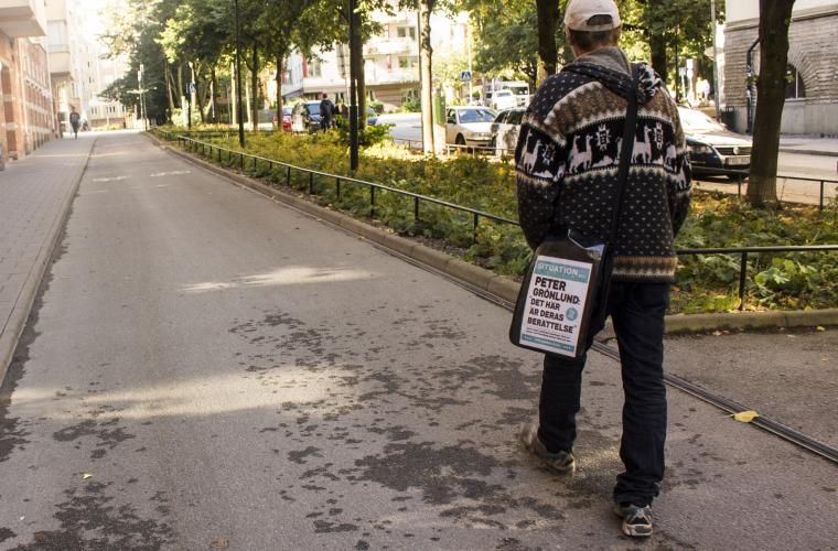 – Situation Sthlm. Kom och köp Situation Sthlm, ropar en äldre man utanför Södra stations uppgång mot Swedenborgsgatan.