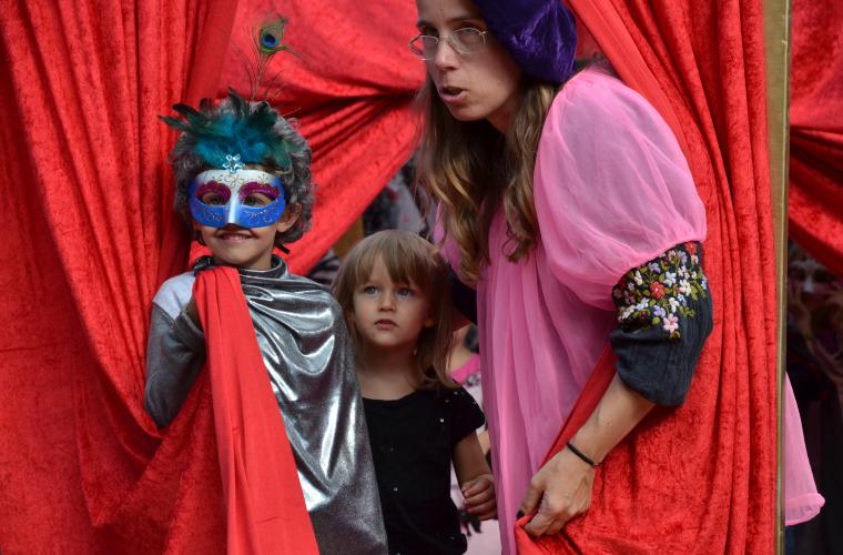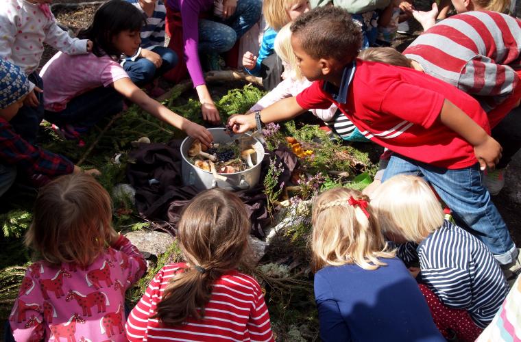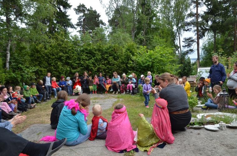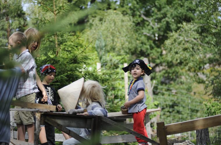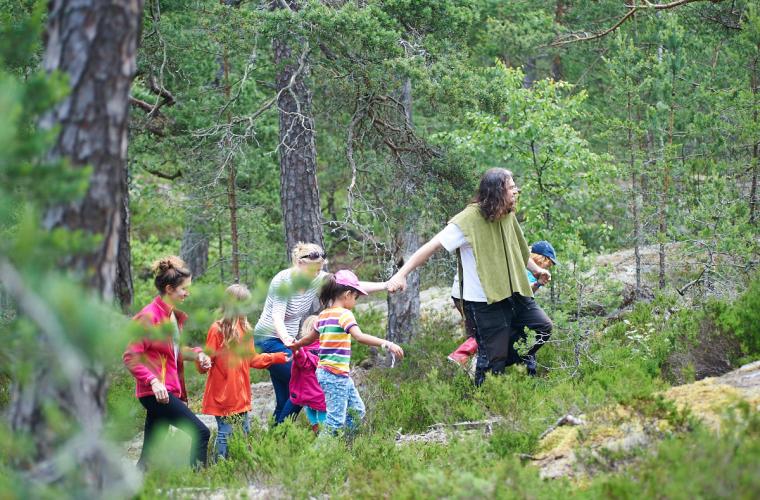 En grupp vuxna och barn leker en hel dag i skogen på Ingarö i Stockholm. De bygger först en liten by tillsammans och sedan visar det sig att farliga varelser lurar i skogen och att gruppen behöver samarbeta för att kunna utmana dem. På eftermiddagen finns möjlighet att leka och klä ut sig i olika sammanhang som ett slott, en cirkus och ett sjörövarskepp.