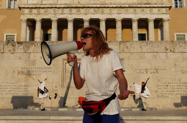 • Den demokratiska krisen i Grekland är ett exempel på en händelse som snarare förstärker och påskyndar den ohållbara situation vi hamnat i, än leder till konstruktiva lösningar, menar skribenten. Här protesterar en aktivist från Attac mot åtstramningarna.