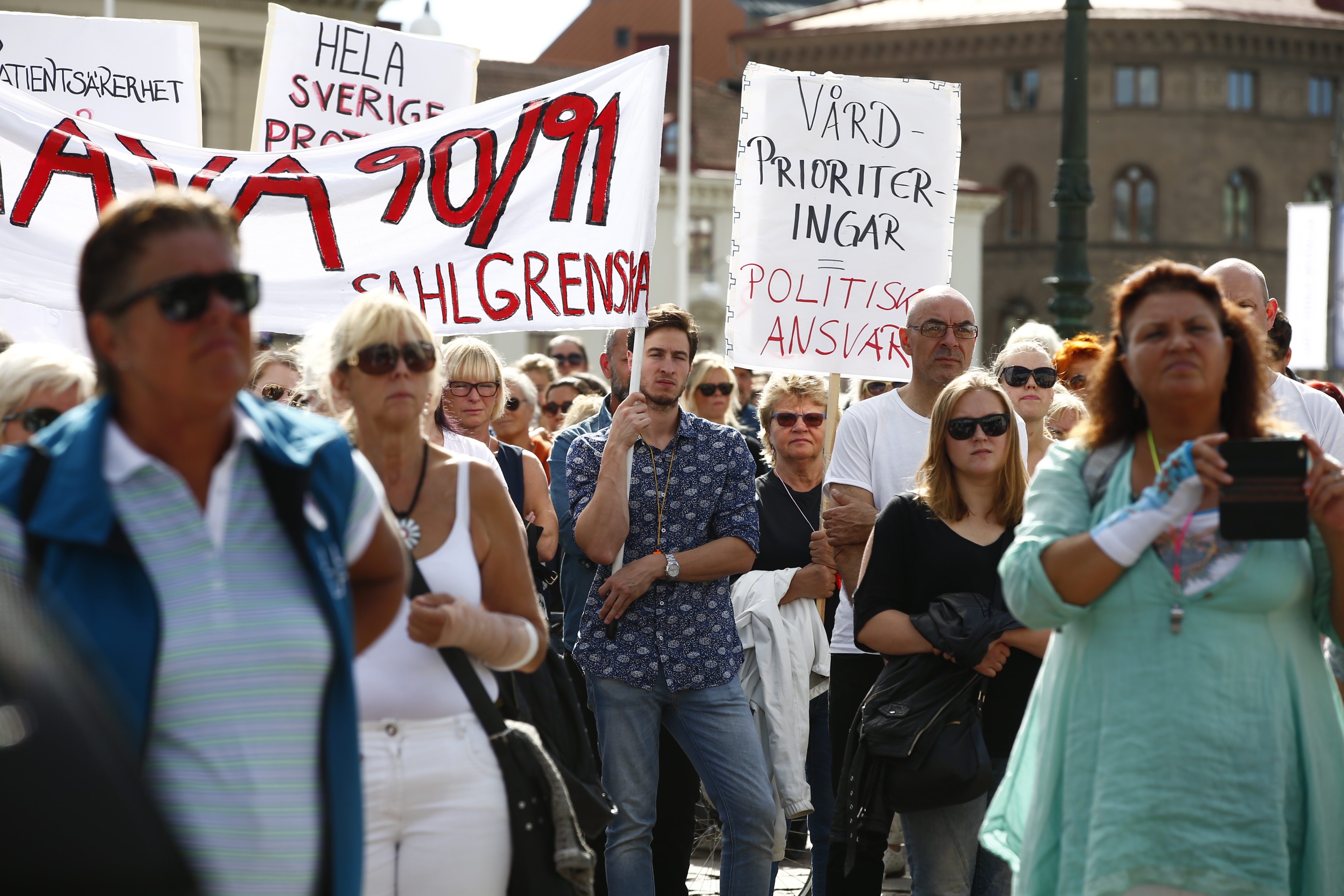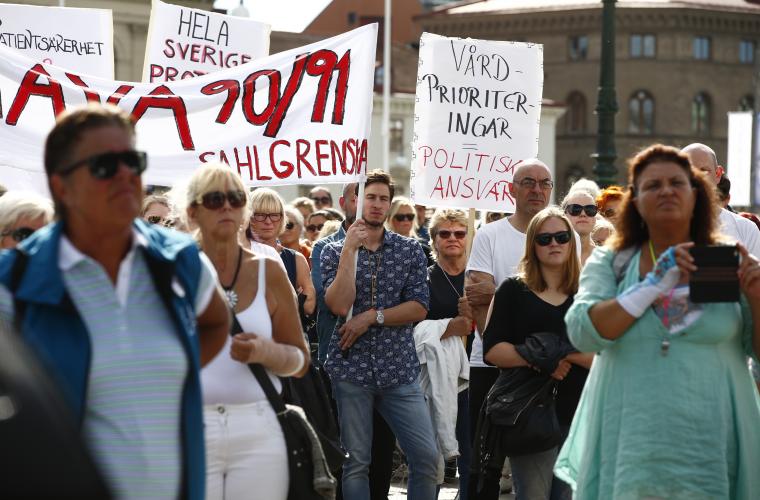 • Vårdpersonal demonstrerar på Gustaf Adolfs torg i Göteborg för en bättre vård och arbetsmiljö.