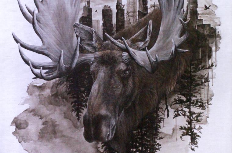 Hennes målningar, oftast svart-vita i akryl, utstrålar mycket av det lugn som hon säger sig hitta i skogen. De föreställer högresta hjortar som blickar mot betraktaren, flygande korpar, tallskog och blåbärsris.
