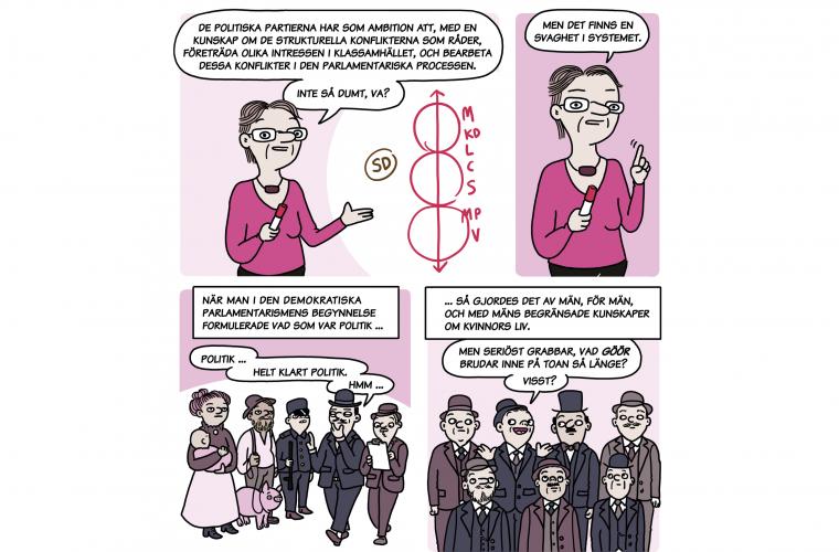 – Jag tror att tröskeln är lägre till serier just för att formatet är något som de flesta känner igen från när de var barn och läste serietidningar. Serier har ju länge varit förknippade med barn och inte haft någon hög status eller plats på kultursidorna, åtminstone i Sverige. Och det händer något kul när man använder just det igenkännbara uttrycket till något så ”allvarligt” som politisk teori. Sedan tror jag att serieformatet fungerar lite på samma sätt som att gå på ett faktiskt Homeparty med Gudrun. Man får ju träffa Gudrun, om än som seriefigur, och får ett ansikte och en person till orden.