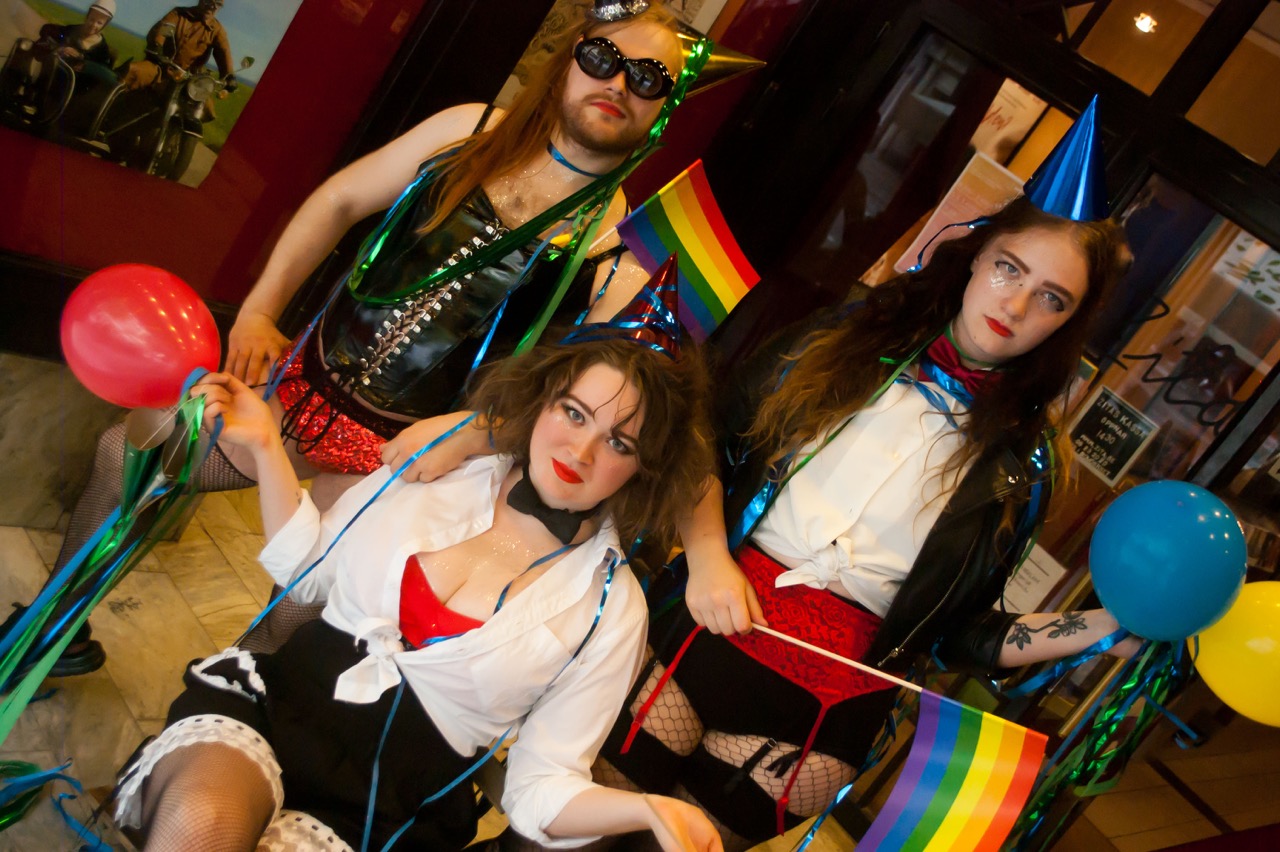 • Sebastian Thelander Sjöstrand, Carolina Oscarsson och Tora Enkvist uppklädda för shadow cast.
