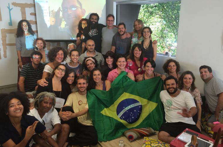 Omställningsrörelsen kom till Brasilien omkring 2008 efter att eldsjälen May East hörde talas om den när hon bodde i den brittiska ekobyn Findhorn. Hon samlade ihop fler intresserade och ordnade den första omställningsutbildningen i Brasilien. Sedan dess har det blivit över 100 kurser runt om i det stora landet, ofta med mellan 30 och 45 deltagare per gång.