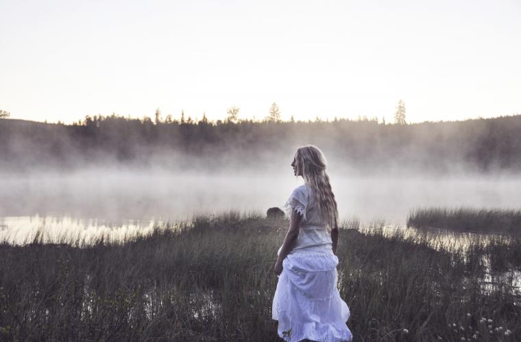 Det är gryning och en tunn vit dimma ligger över den spegelblanka tjärnen. Jonna Jinton sätter huttrande på sig en vit, fladdrande klänning och kliver barfota på de daggvåta grästuvorna. Hon ställer sig vid vattenbrynet med ryggen mot kameran som står riggad på ett stativ några meter bort. Klicken från fjärrutlösaren är det enda ljud som hörs genom skogen.