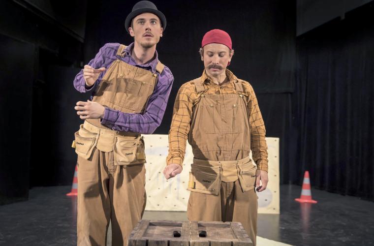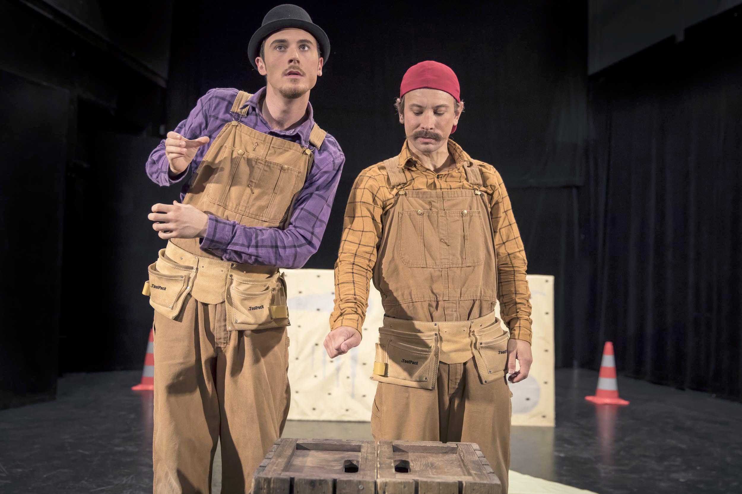 – Den handlar om två snubbar som fixar och lagar saker ihop. Vi har tagit mycket inspiration från Pat & Mat, ett gammalt tjeckiskt stop motion-program, men även gamla slapstick-filmer. Det är en föreställning i slapstick och fysisk komik-anda, säger Rickard Hessler som också var initiativtagare till föreställningen.