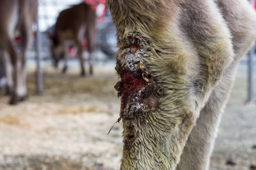 När Cirkus Maximum avslutade sin årliga turné på Heden i söndags var Djurrättsalliansen där för att protestera mot att djur används i föreställningarna. Väl på plats fick medlemmar från organisationen syn på en kamel med ett stort öppet sår.