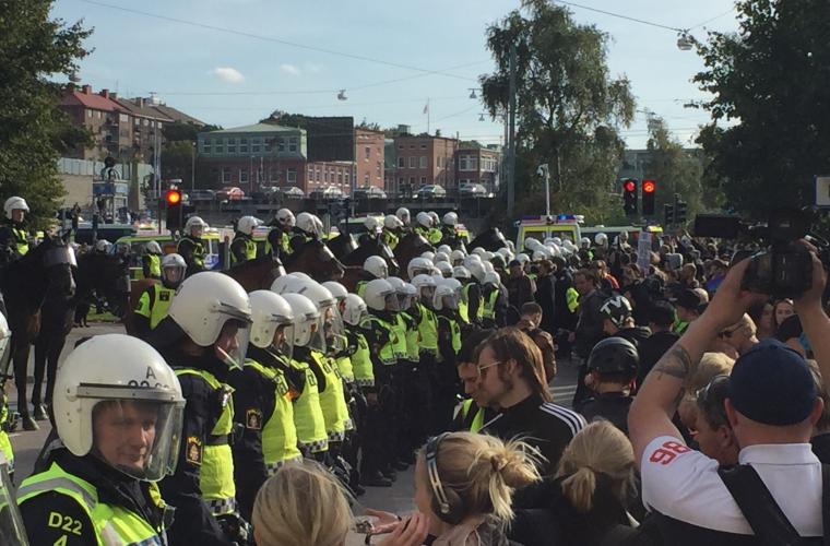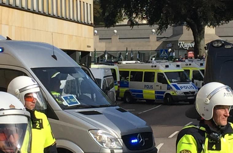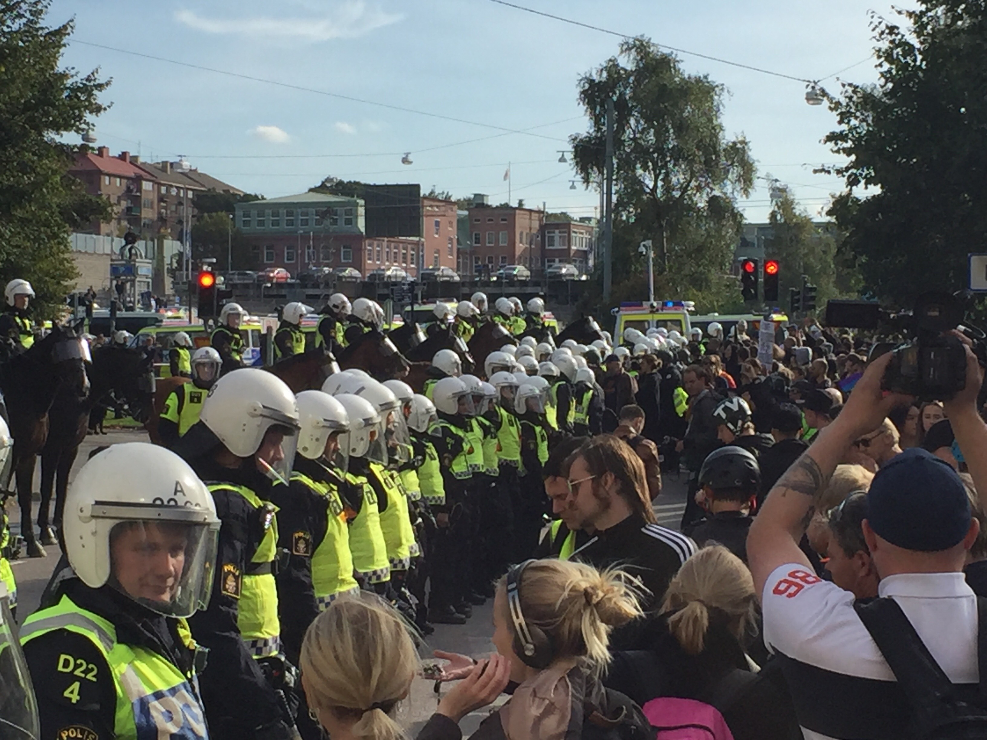 Just nu är det riktigt rörigt kring Fabriksgatan dit NMR fördes av polis för att nå sin startposition för sin demonstration. Men så långt har de inte kommit. Just nu hålls NMR bakom Ica Fokus medan ett tusental motdemonstranter blir bortmotade av polisen med hästar och hundar. Läget står still just nu men många har lämnat Heden och rört sig mot det oroliga området. Fyra stora bussar har just anlänt utanför Ica Fokus, mängden människor i området är enormt stor.