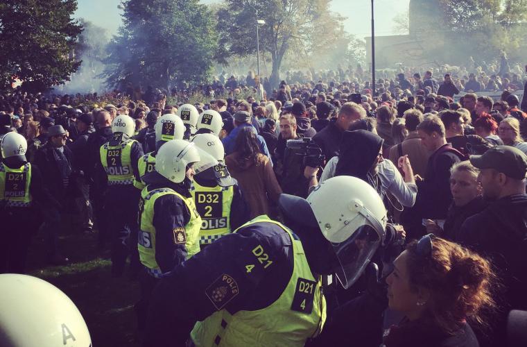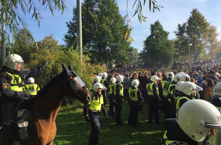Klockan är runt tre på eftermiddagen och egentligen är det nu demonstrationstillståndet för NMR, som alltjämt befinner sig vid Focus-huset utom syn- och hörhåll från de allra flesta, går ut. De gator som NMR skulle vandra på är nu motdemonstranternas, och många har samlats på vägen mellan Liseberg och Svenska mässan. På ena sidan syns kravallutrustade poliser och rader av piketbussar – kanske hundra meter bort motdemonstranter varav en del är maskerade.