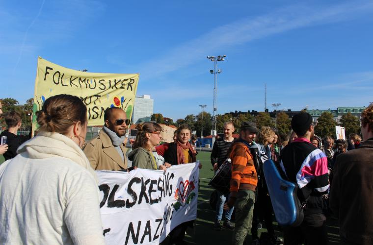 Trots en viss osäkerhet i luften om vad som kan tänkas hända denna dag är folkfest en av de vanligaste beskrivningarna av stämningen på platsen. Medan Folkmusiker mot rasism dansande spelar låt efter låt nere på gräset med såväl barnfamiljer som pensionärer omkring sig är liknelsen träffande.