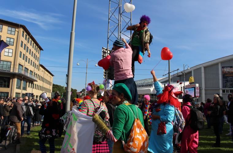 Vid Scandinavium är stämningen nästan uppsluppen, om än något vilsen. Clowner i full mundering skanderar glatt och utanför Burgårdsgymnasiet står en sångmanifestation med människor i alla möjliga utklädnader.