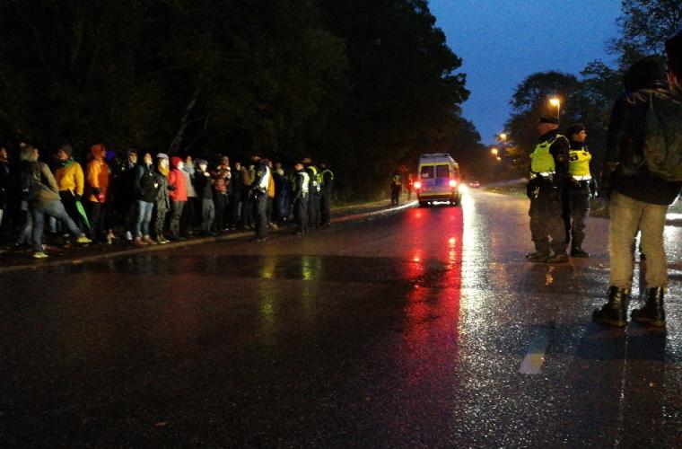 Ytterligare personer har kommit till platsen för att protestera. Enligt arrangörsgruppen handlar det om runt 150-200 personer. Talkörer hörs: "Migrations, migrations, stop deportations" och "Den som flyr har inget val – ingen människa är illegal". Polisen har byggt en avspärrning med stängsel som de som protesterar står bakom. Ingrid Broms, från arrangörsgruppen, har kontakt med de ungdomar och unga män som befinner sig inne i förvaret.