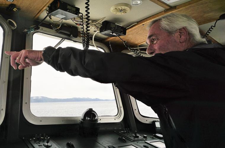 – Där har vi ett gäng knölvalar, säger kapten Bill MacKay och pekar mot en vik mellan några mindre öar.