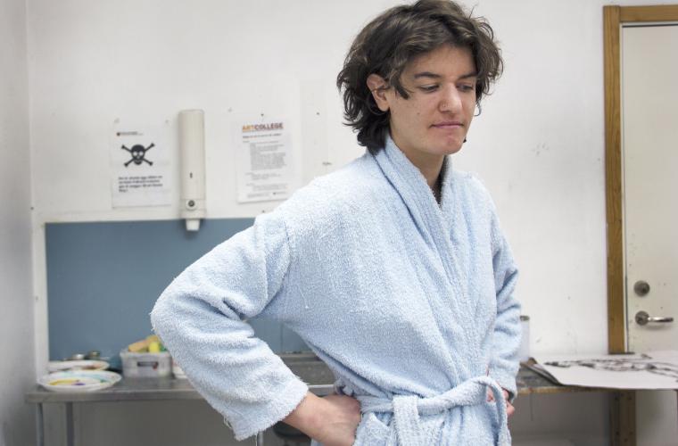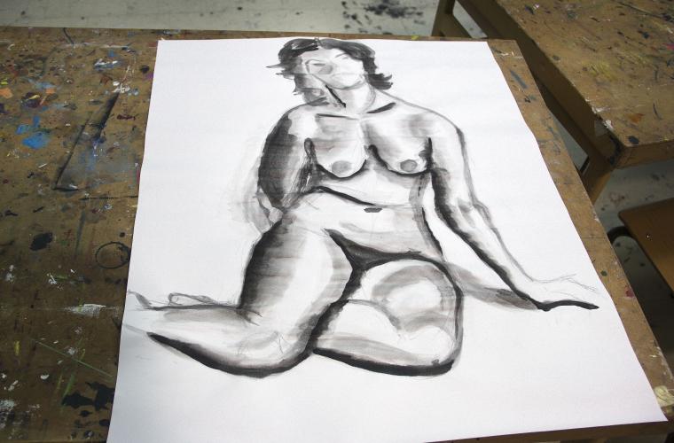 Hon knyter upp skärpet och låter badrocken falla till golvet, sätter sig i den givna positionen, på sidan med benen åt höger, stödd på ena armen. Blicken fäster hon stadigt på väggen bakom deltagarna som sitter och står i en båge framför den lilla scenen. Elsa ser fullständigt lugn ut, trots att hon precis tagit ett kliv ut i det utsatta att vara naken inför okända människor.