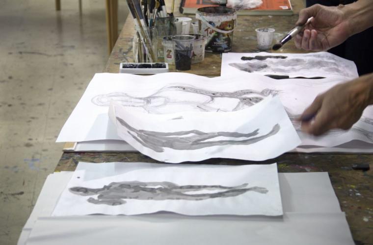 Under höga takfönster som släpper in himlens eget ljus är fotarbetet kvickt hos läraren Tomas Ekvall när han rör sig mellan färgfläckar för att visa var och en hur de ska göra för att komma vidare i processen, forma linjer, skuggor och färg till en kropp. Ovanför ateljén börjar regnet piska mot glaset, dunklet motverkas av flera uppställda strålkastare som famnar modellen Elsa med värme.