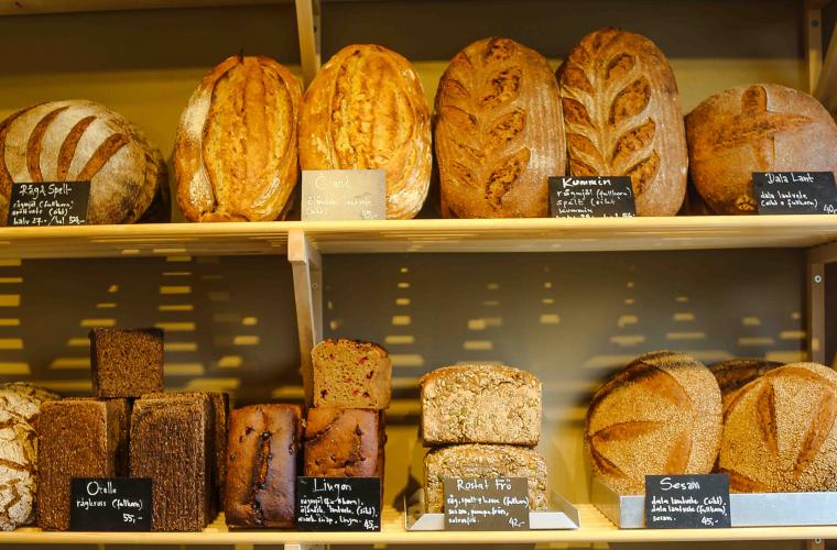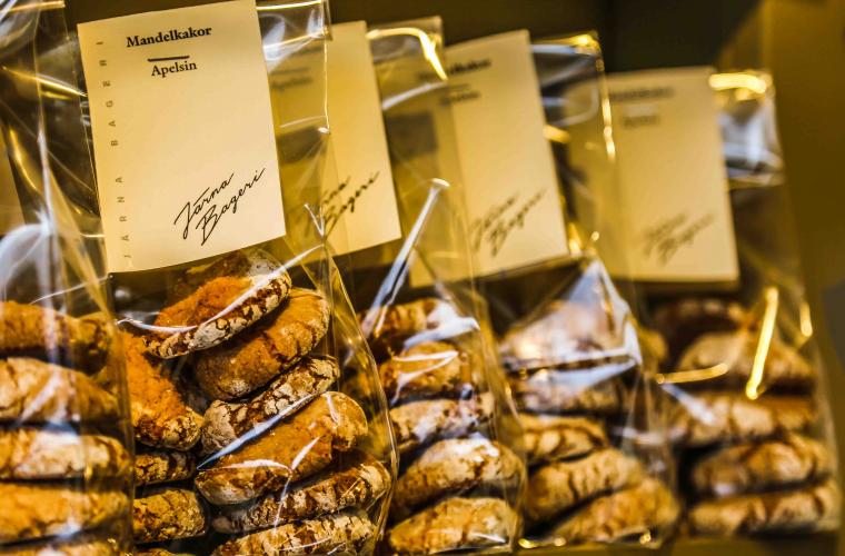 Mandel- och hasselnötskakor vilar stilrent inpackade i påsar på hyllorna längs väggen mitt emot brödhyllorna. I butiken kan man också köpa müsli och olika kulturspannmålsmjöl på lösvikt.
