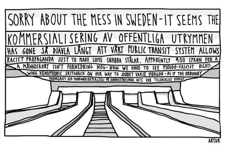 Hösten 2015 spred Sverigedemokraterna reklamannonser mot tiggare i Stockholms tunnelbana, SL. Artur Szandrowski ritade en satirbild som var stark kritisk mot SD:s främlingsfientliga budskap men även mot SL som gav utrymme åt SD:s propaganda. Bilden blev viral och Artur Szandrowski blev något av en tecknarkändis över en natt.