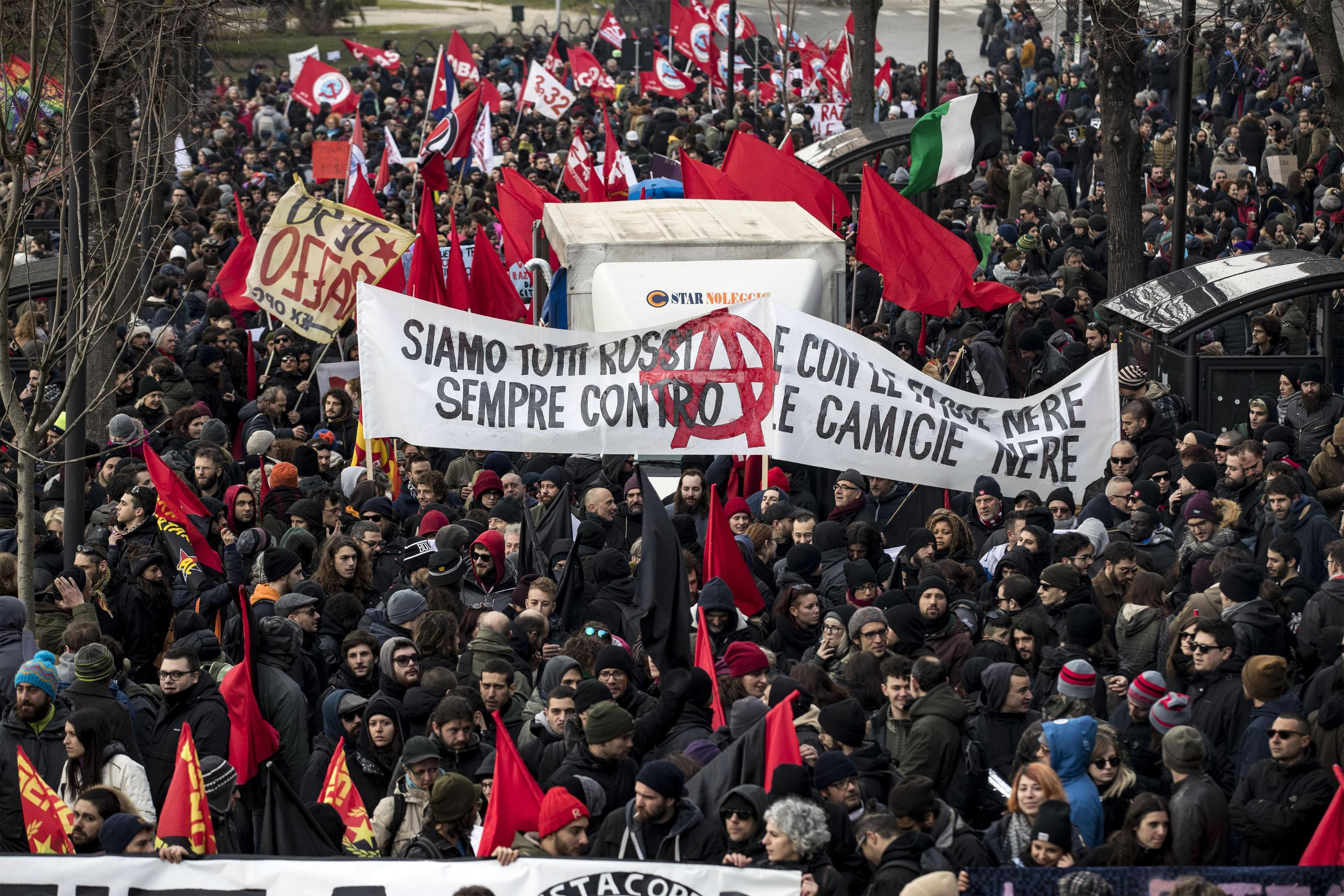 Busslaster med demonstranter från hela landet tog sig i helgen till den antifascistiska demonstrationen Macerata i centrala Italien. Marschen hölls i protest mot förra helgens rasistiska terrordåd i staden och de tilltagande högerextrema strömningarna i landet.