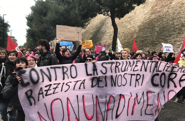 I demonstrationen i Macerata deltog också den feministiska rörelsen Non una di meno med en påtaglig närvaro. De protesterade mot det rasistiska våld som utförts i kvinnors namn och marscherade under parollen “ingen rasistisk instrumentalisering av våra kroppar”.