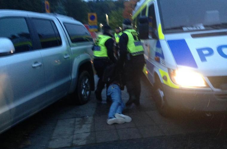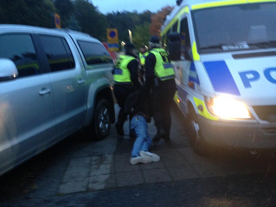 – Det blev en ganska tumultartad situation och jag minns att det skreks och gapades runt mig, Till slut gick två poliser fram till mig och drog så hårt att jag skrek till och de som satt runtomkring släppte mina armar och ben. Jag blev därefter släpad och satt på marken innan de satte mig i polisbussen, berättar han.