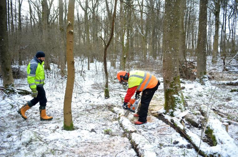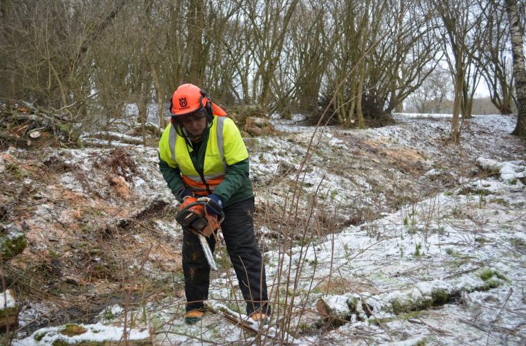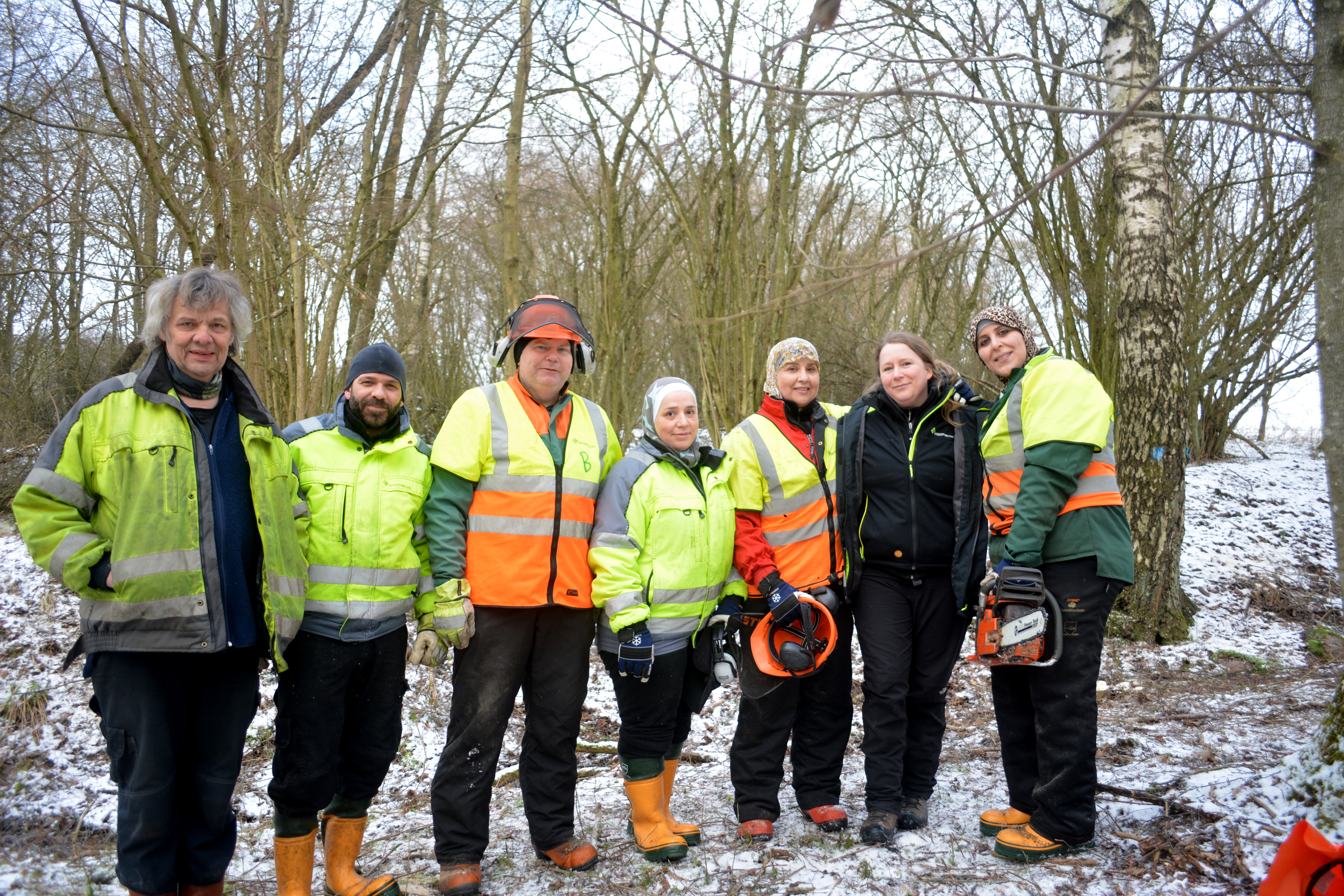 Det är en kall vinterdag med skånska mått mätt, några minusgrader och ett tunt lager snö på marken. Men det hindrar inte Manal Al Kaiyali, Sabah Al Khadar, och de andra i arbetslaget som röjer träd och sly i en skogsdunge i Kungsmarkens naturreservat.