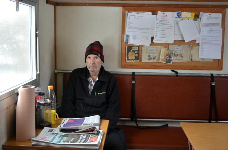 Det har blivit dags för rast och arbetslaget går mot ”hyddan”, en personalvagn där de kan byta om, fika och värma sig. Där sitter redan Ulf Sjöstrand och tar igen sig.