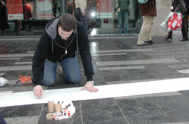 Pangea utför en konstaktion där de konstbombar Hötorget. Meningen är att skapa ett kollektivt konstverk som alla kan bidra till. På plats finns bland annat ritpapper, kritor, saxar och såpbubblor att använda.