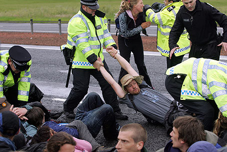 • Polisen griper aktivister som blockerar en motorväg under G8-mötet i Skottland två år sedan.