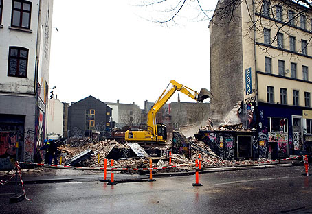 Tillsammans med några hundra andra ungdomar och grannar har han kommit för att lägga en blomma och ta ett sista farväl av den historiska byggnaden. Man kan fortfarande höra sirener när polisen eskorterar bilar till och från rivningsplatsen. Flera av företagen som är inhyrda med anledning av rivningen, har upplevt sabotage. Ett flyttföretag har förlorat två av sina bilar i bränder och vill inte ta fler uppdrag som har med Ungdomshuset att göra.