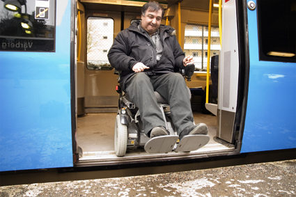 – Det är ungefär som när man kastar macka vid stranden, man får satsa på att studsa upp. Sedan får man hoppas att man kommer in innan dörrarna stänger och att ingen står i vägen. Det händer mig minst en gång i veckan att jag fastnar och får be en medpassagerare om hjälp. Men det är inte så lätt då en elstol väger 100–200 kilo, plus gubben däri.