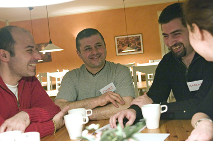 Runtom i lokalen hörs röster. Gester får visa när språket inte räcker. Man lyssnar tålmodigt. Vid ett bord börjar man skratta. Vid ett annat pratar man arabiska en stund.Man blir trött av att försöka uttrycka sig på ett nytt språk. Adam frågar om Raz vill ha den sista kakan. Raz ler och tackar nej. De två timmarna har gått och de flestas miner är glada. Många stannar kvar en stund. Det är ju en hel vecka kvar tills nästa träff.