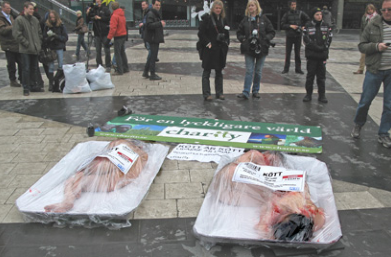 Forskning visar att många djur kan känna lidande på i stort sett samma sätt och i lika hög grad som vi människor kan. Vår konsumtion av animaliska produkter gör att djur plågas. Kycklingindustrin är kanske den mest fasansfulla. En kyckling trängs med fler än tjugo andra per kvadratmeter. Luften hon andas är så dammig och ammoniakhaltig att Arbetsmiljöverket råder besökande människor att bära skyddsmask. Inte nog med att kycklingen får svåra andningsproblem, hon får även hudskador av all urin och smuts som täcker det golv hon går på. Kycklingen plågas också av den skarpa belysningen som är på 22 timmar om dygnet. Belysningen, tillsammans med en sjuk framavling för att få kycklingarna att växa så fort som möjligt, gör att många drabbas av invärtes skador. Enligt en studie från Sveriges lantbruksuniversitet har 63,5 procent av alla kycklingar bendefekter.