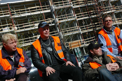 Christer Bodströms brandgula väst reflekterar solljuset och gör det svårt att ordentligt utläsa de svarta bokstäverna på hans rygg: Strejkvakt. Han är nöjd med att Byggnads nu gått från ord till handling men tycker att förbundet gott hade kunnat ta ut fler än de nuvarande 824 medlemmarna i strejk.