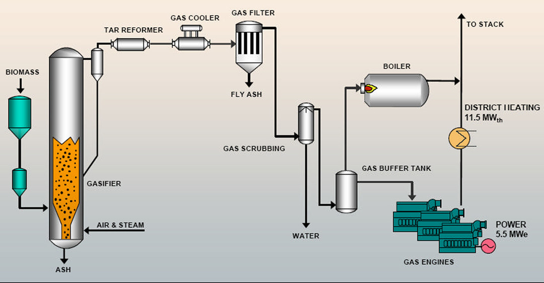 * Drift med gengas innebär att man framställer en lågvärdig gas ur till exempel skogs- eller åkerbränslen i med- och motström eller fluidbäddsförgasare. Både gasturbiner och gasmotorer kan användas och det finns ett antal demonstrationsanläggningar i storleksordning 75 kW upp till 5 MW elproduktion. Det finns åtminstone ett par väl fungerande kraftvärmeanläggningar med gengasdriven förbränningsmotor i MW-klassen. Investeringen i dessa pilotanläggningar har varit hög men förväntas sjunka för kommande anläggningar. Ett problem som måste beaktas är att gasen innehåller höga halter kolmonoxid och speciella säkerhetsåtgärder krävs.
