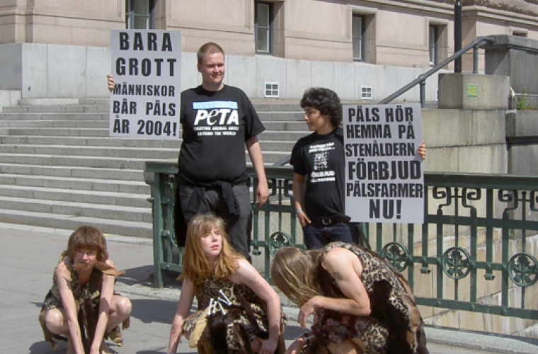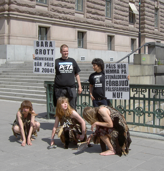 Med yxor i högsta hugg och klädda i djurpälsar, donerade av före detta pälsbärare, trotsade aktivister från Djurens rätt och People for the Ethical Treatment of Animals, PETA, sommarvärmen utanför riksdagen i dag. Genom budskapet "Bara grottmänniskor bär päls' vill organisationerna uppmana regeringen att lämna stenåldern och förbjuda pälsdjursfarmer.